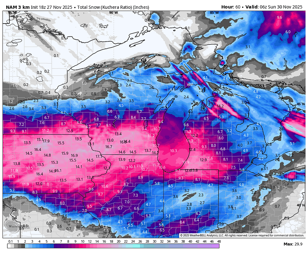 The EURO using the (Kuchera method) utilizing snow ratios higher than 10:1 which is likely, especially later in the storm.
