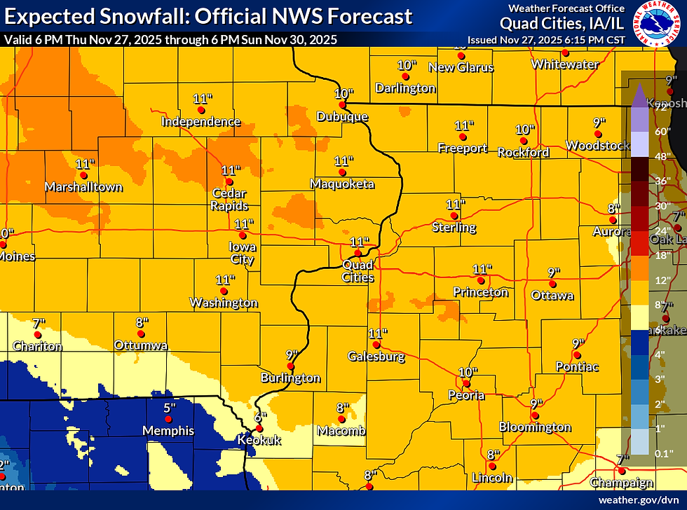 First, many of the winter storm watches that were issued last night have been converted to winter storm warnings today. Most of my counties in pink north of HWY 34 are in warning classification. Further south and east, winter storm watches remain in effect due to some minor uncertainties in track and thermal profiles. As you can see below, the NWS has left open the door to further warning expansion. The bulk of my area is looking at potential accumulations of 8–10 inches, with some banding potential for locally higher amounts.