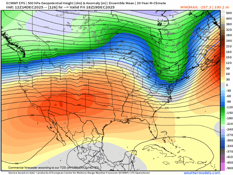 Significant ridging remains likely later this month into Christmas week with moderating temperatures. This will likely also usher in a quieter weather pattern for the same period.